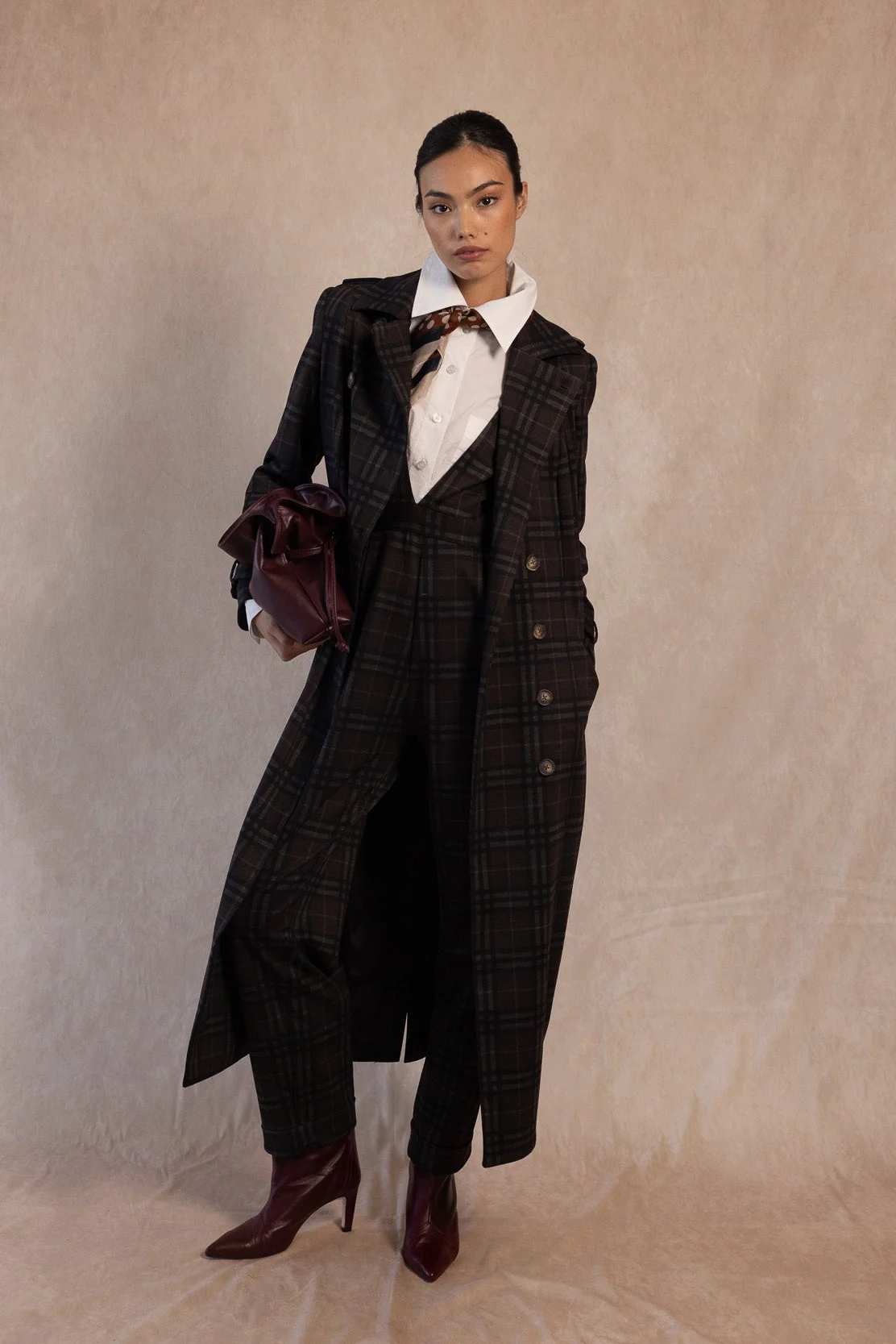 El abrigo largo de cuadros de Coosy representa la esencia del estilo refinado y contemporáneo. Confeccionado en un tejido de inspiración sartorial con estampado de cuadros en tonos oscuros, esta prenda combina la precisión del corte clásico con una silueta fluida y poderosa.