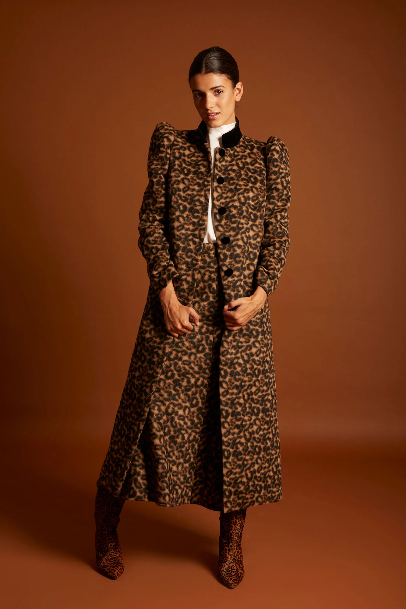 El estampado animal print le aporta personalidad y versatilidad, convirtiéndolo en el abrigo perfecto tanto para invitadas de eventos especiales como para looks de día a día con un toque de tendencia.