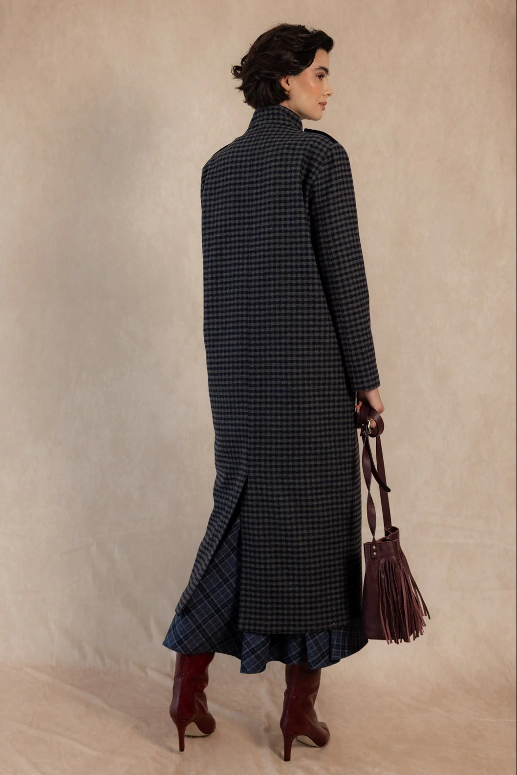 El Abrigo Otilia es una pieza icónica que redefine la elegancia atemporal. Confeccionado en un tejido de cuadros finos en tonos oscuros, combina estilo clásico y sofisticación moderna. Su corte largo y estructurado estiliza la silueta, mientras el cuello mao y los botones forrados aportan un toque refinado y distintivo.