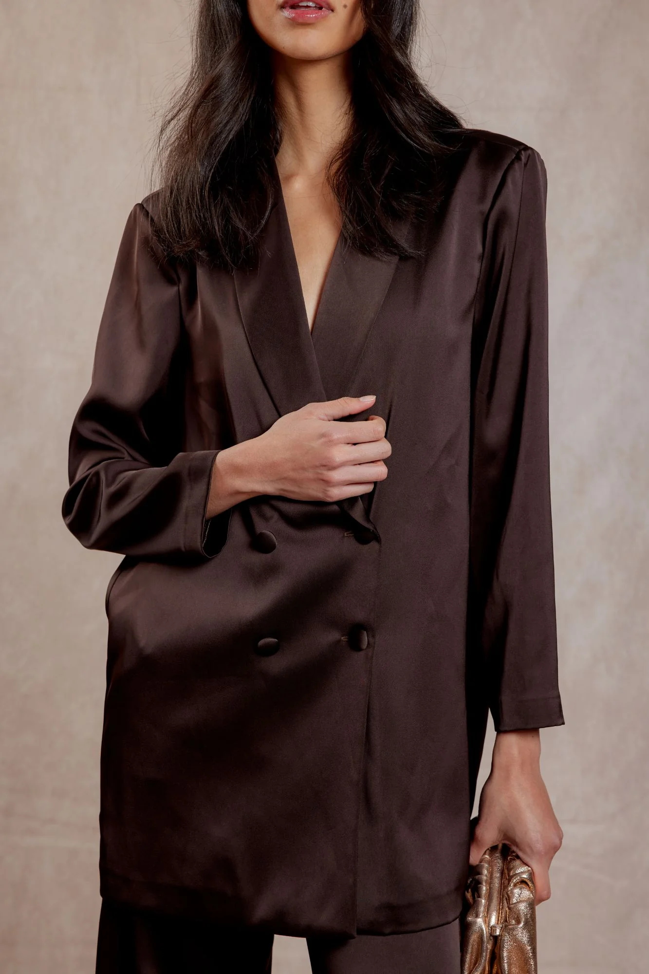 El Blazer Lita Marrón de Coosy es la prenda perfecta para elevar cualquier look con un toque sofisticado y contemporáneo. Diseñado en un favorecedor tono marrón oscuro y confeccionado en un tejido de acabado satinado, este blazer destaca por su corte recto y fluido, ideal para estilizar la figura sin perder comodidad.