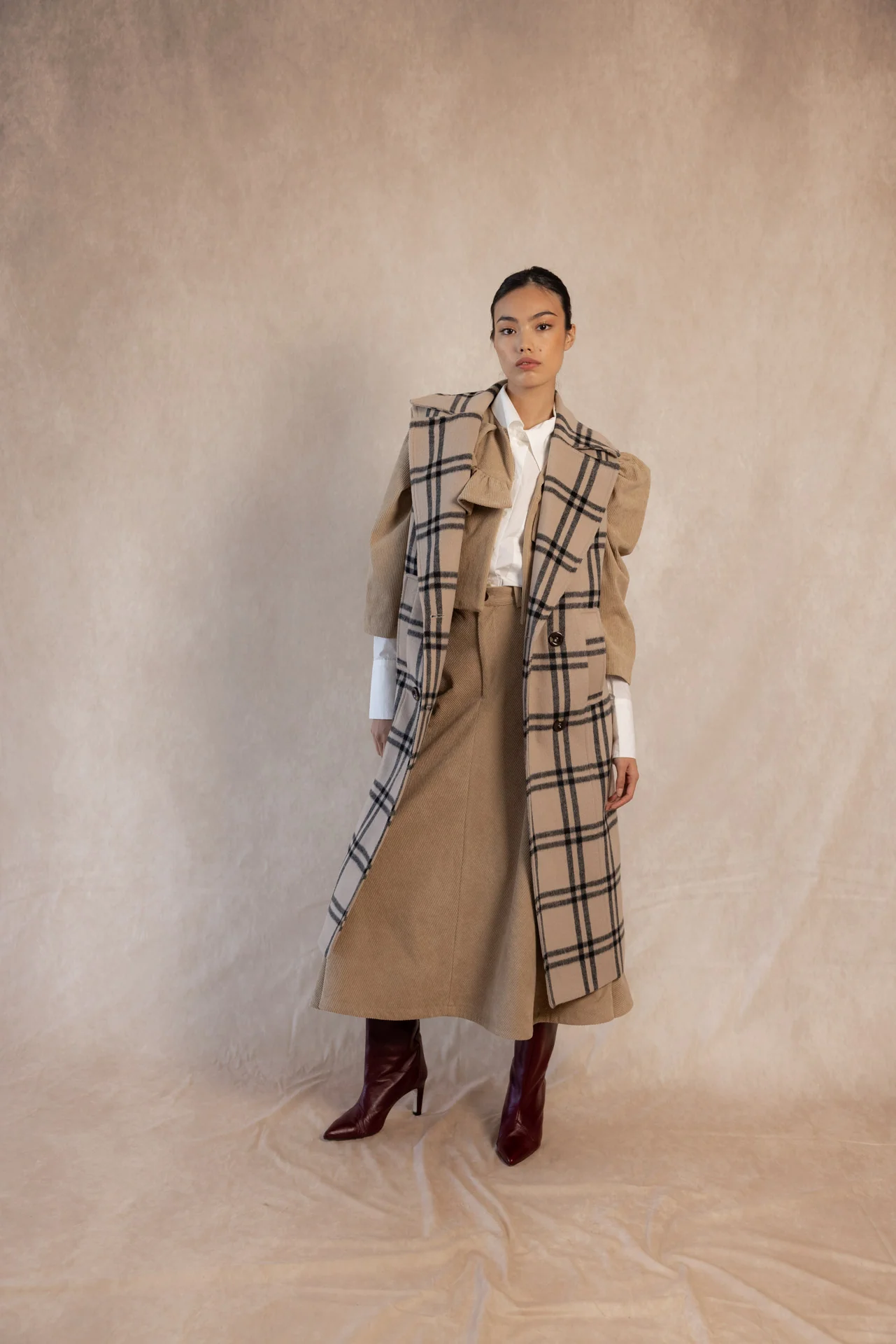 El Chaleco Piero Crudo de Coosy es una prenda icónica que combina elegancia, calidez y versatilidad. Su diseño largo y estructurado, confeccionado en un tejido suave de tono crudo con estampado de cuadros en contraste, aporta luminosidad y sofisticación a cualquier look de otoño e invierno.