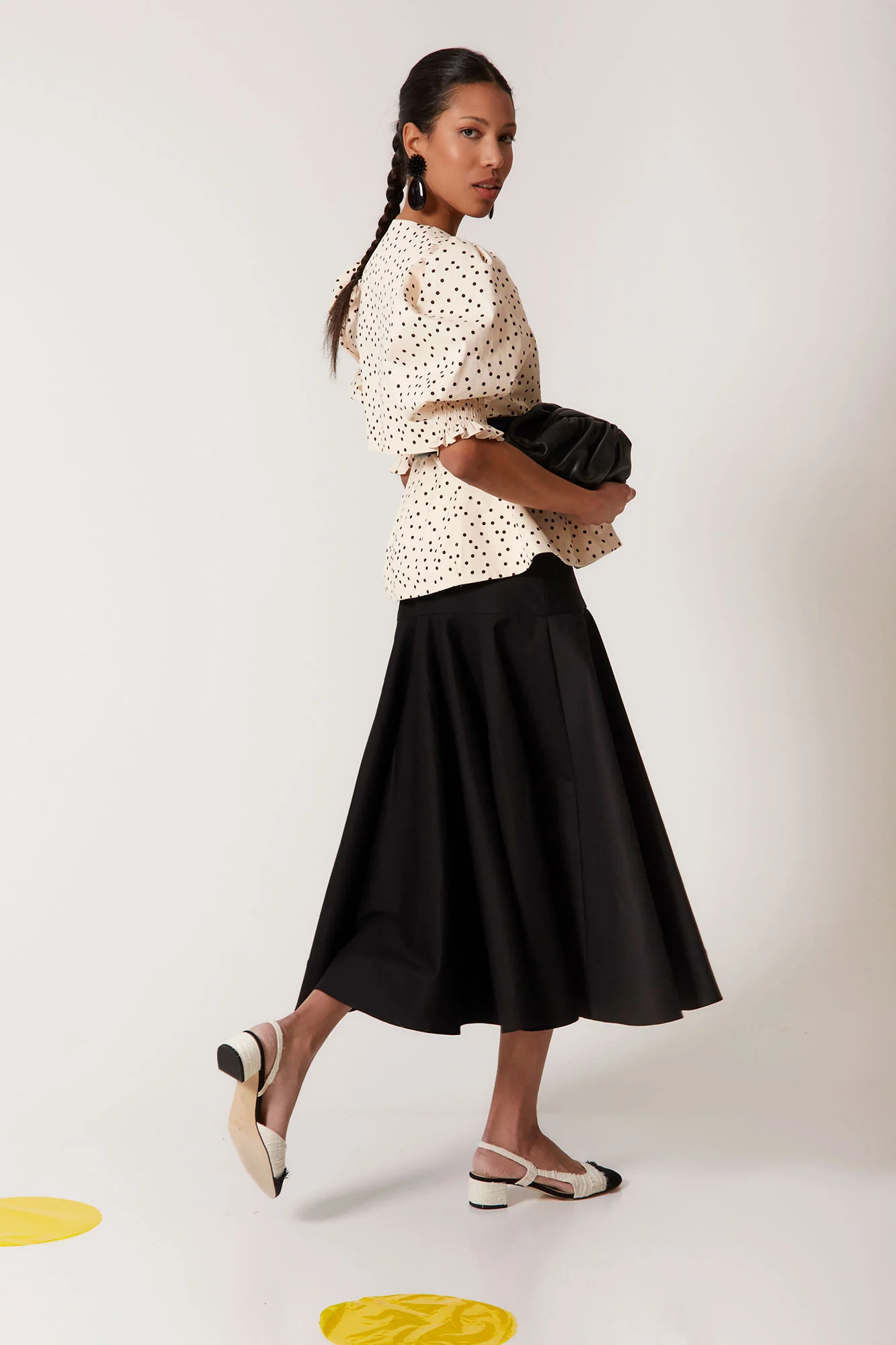 Confeccionada en tejido estampado de lunares negros sobre fondo crudo, la chaqueta corta estructurada para mujer destaca por su diseño arquitectónico y sus mangas abullonadas con volumen marcado en hombros. El escote abierto enmarcando el busto y el corte a la cintura crean un equilibrio perfecto entre romanticismo y modernidad.