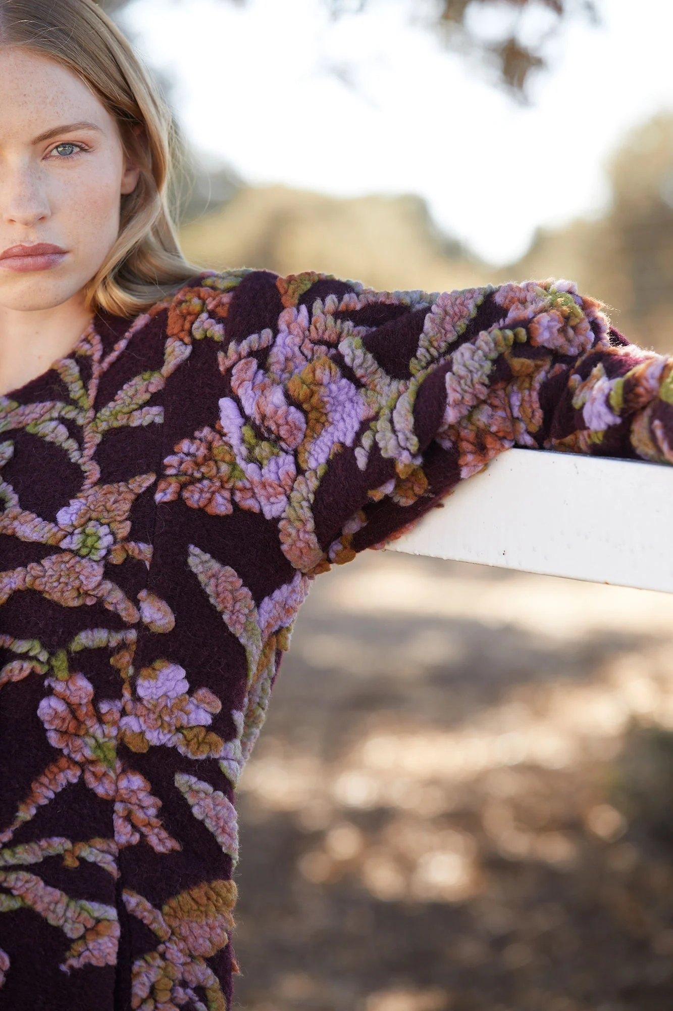 La chaqueta Lana de Coosy es una prenda icónica que combina arte textil, textura y sofisticación. Confeccionada en un tejido cálido de fondo burdeos, destaca por su espectacular bordado floral en relieve, que mezcla tonos malva, verdes y rosados creando un efecto tridimensional único.