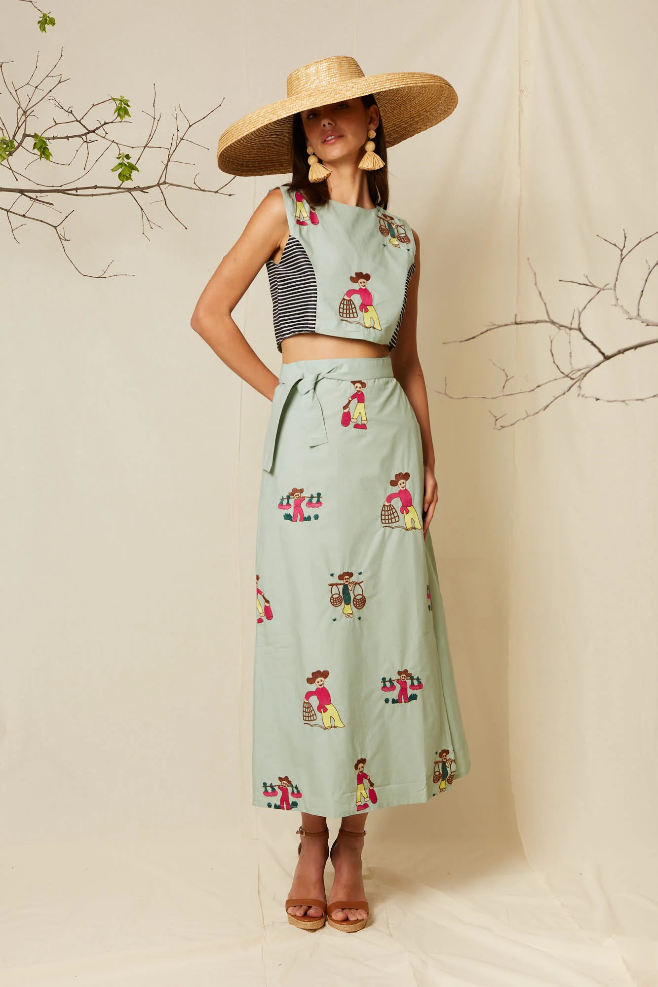 Confeccionado en un tejido ligero y cómodo en tono verde suave, el conjunto destaca por su estampado ilustrado inspirado en escenas asiáticas, que aporta personalidad y exclusividad a la prenda. El top corto de líneas limpias se adapta perfectamente al cuerpo, mientras que la falda midi-larga con cintura ajustable mediante cinturón del mismo tejido crea un movimiento fluido y femenino.