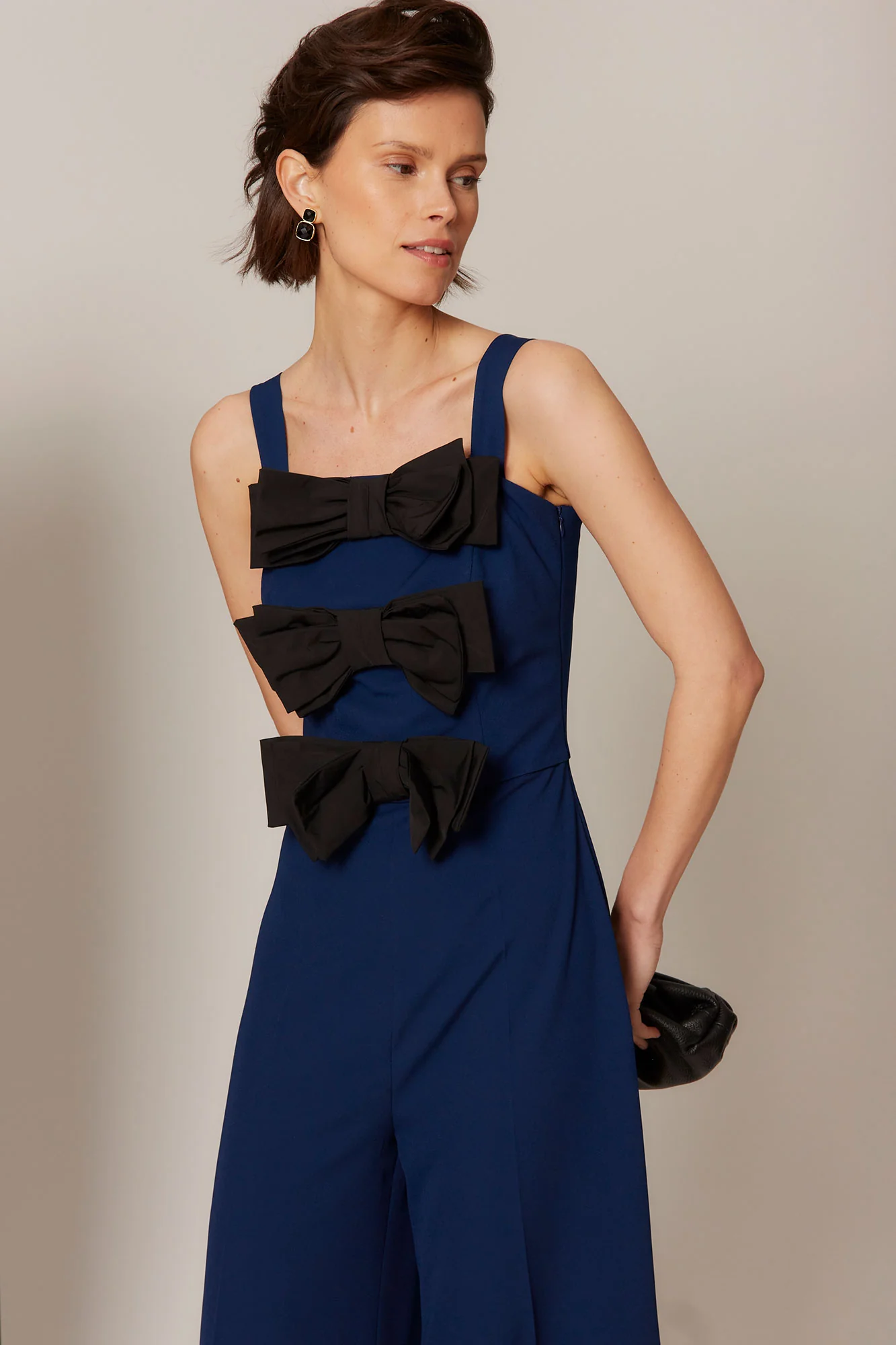El Mono Gabriela es una prenda impactante y elegante, diseñada para convertirse en el centro de todas las miradas. Confeccionado en un favorecedor tono azul profundo, destaca por su escote palabra de honor y sus lazos negros en contraste colocados en el delantero, que aportan un aire sofisticado y muy femenino.