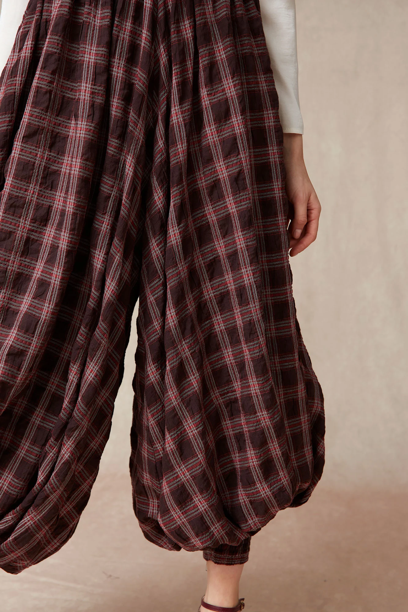 Este pantalón de cuadros estilo bohemio es la prenda perfecta para elevar tus looks de temporada con un aire sofisticado y femenino. Confeccionado en un tejido fluido y ligero, destaca por su volumen sutil, su cintura alta fruncida y su bajo ajustado tipo bombacho, que estiliza la silueta y aporta movimiento.