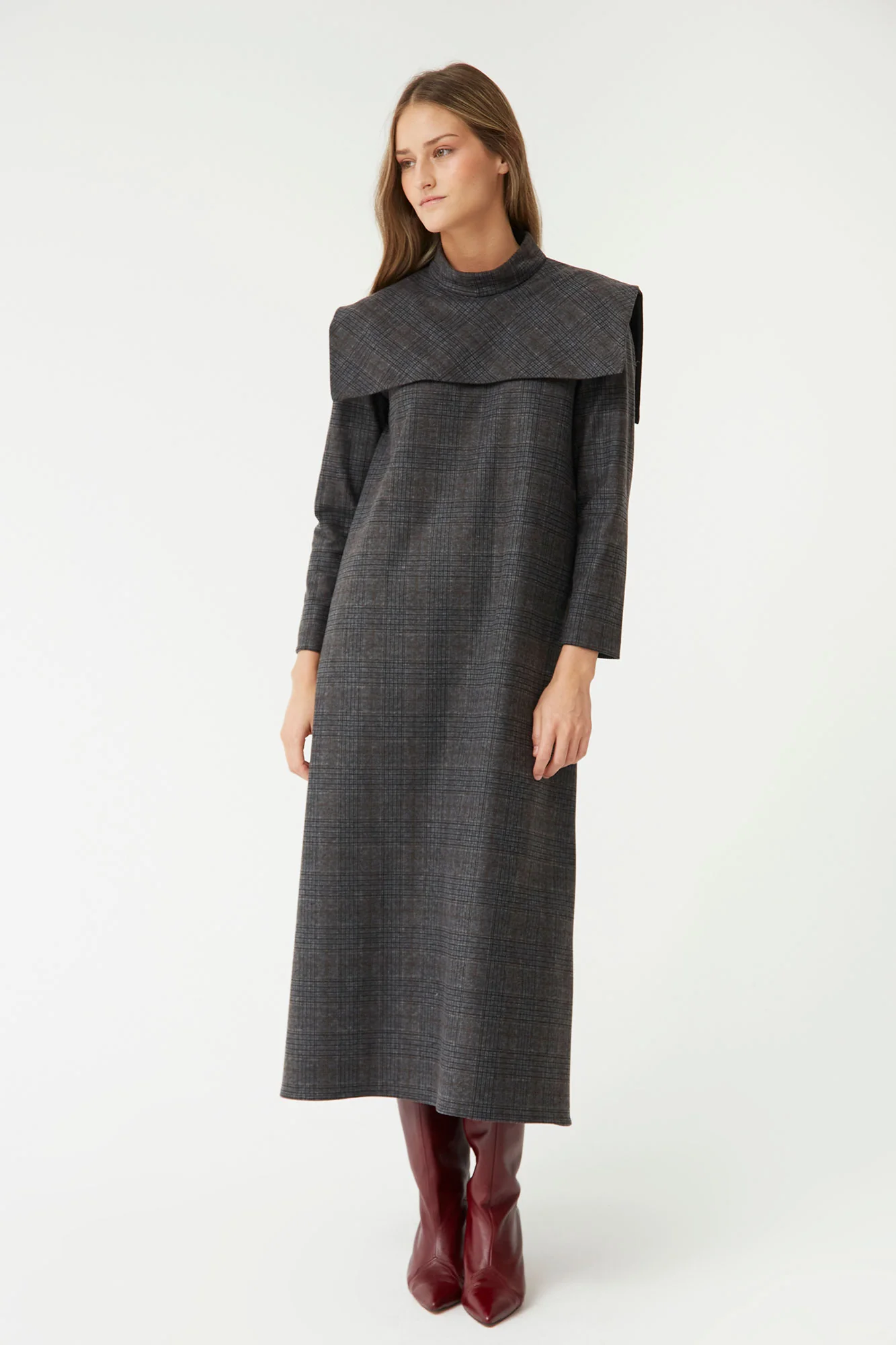 Confeccionado en un tejido de cuadros discretos en tonos grises, este vestido ofrece una textura suave y un ajuste cómodo, ideal para los meses de otoño e invierno. Su largo midi y manga larga lo convierten en una opción versátil para eventos de día, reuniones o looks de oficina con un aire contemporáneo.